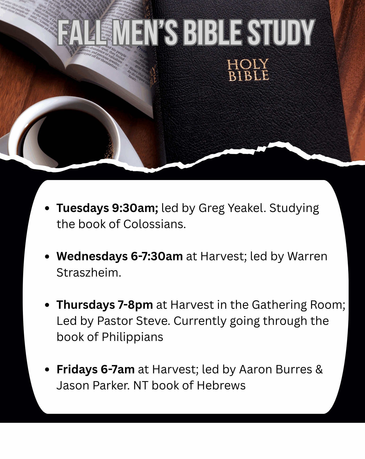 It is our desire to see the men at Harvest Evangelical Free Church raised up to become the leaders that God calls us to be. The men’s ministry at Harvest will challenge you and provide a great place for fellowship and study with men who want to win at home and at work. We encourage you to take the next step in your spiritual growth and check it out! We’ll help you incorporate the Word of God into your everyday life.